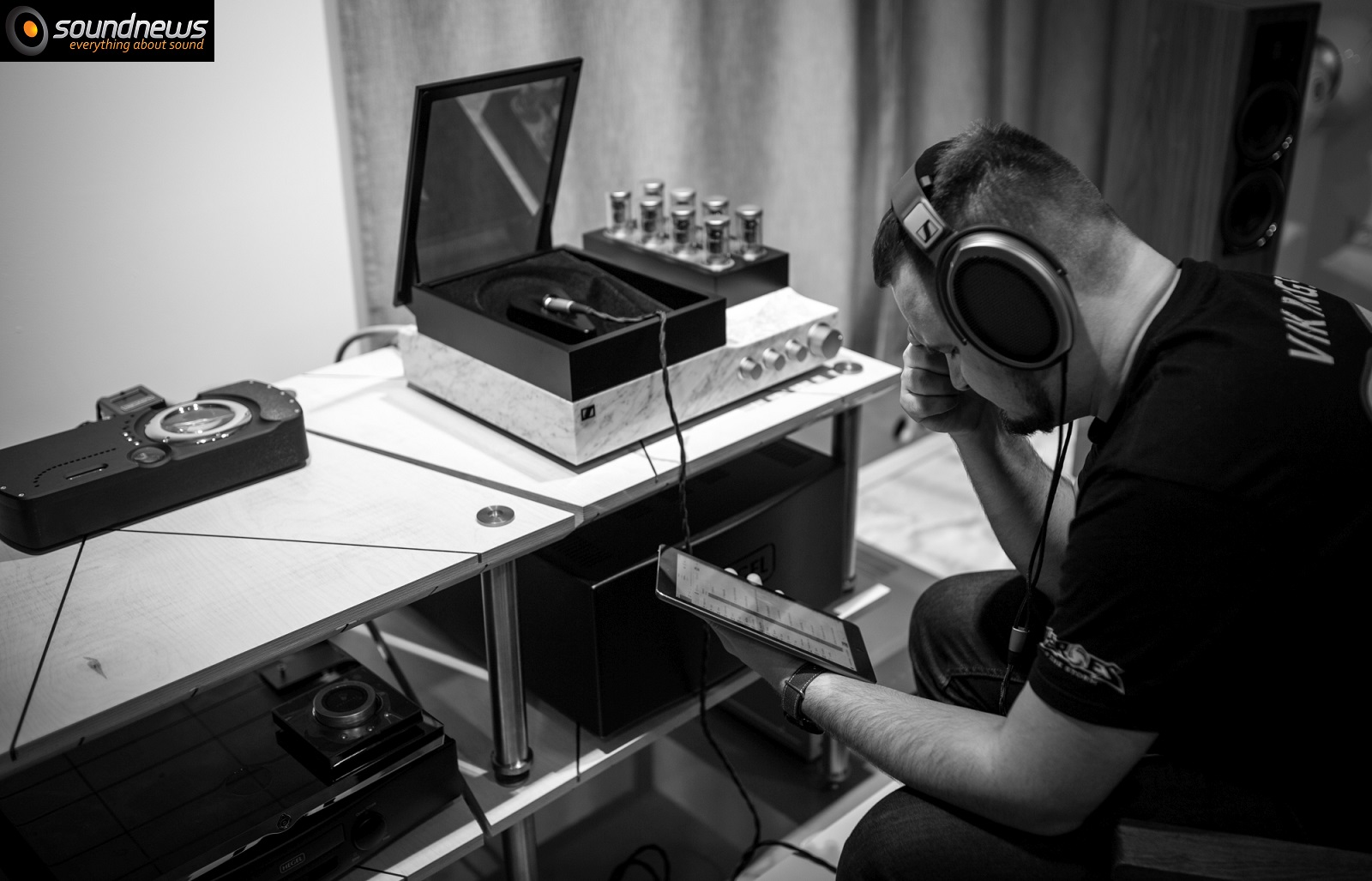 Everything we see in front of us is actually a 3-in-1 system: a pair of electrostatic headphones, a tube-based headphone amplifier and a Hi-Resolution DAC.