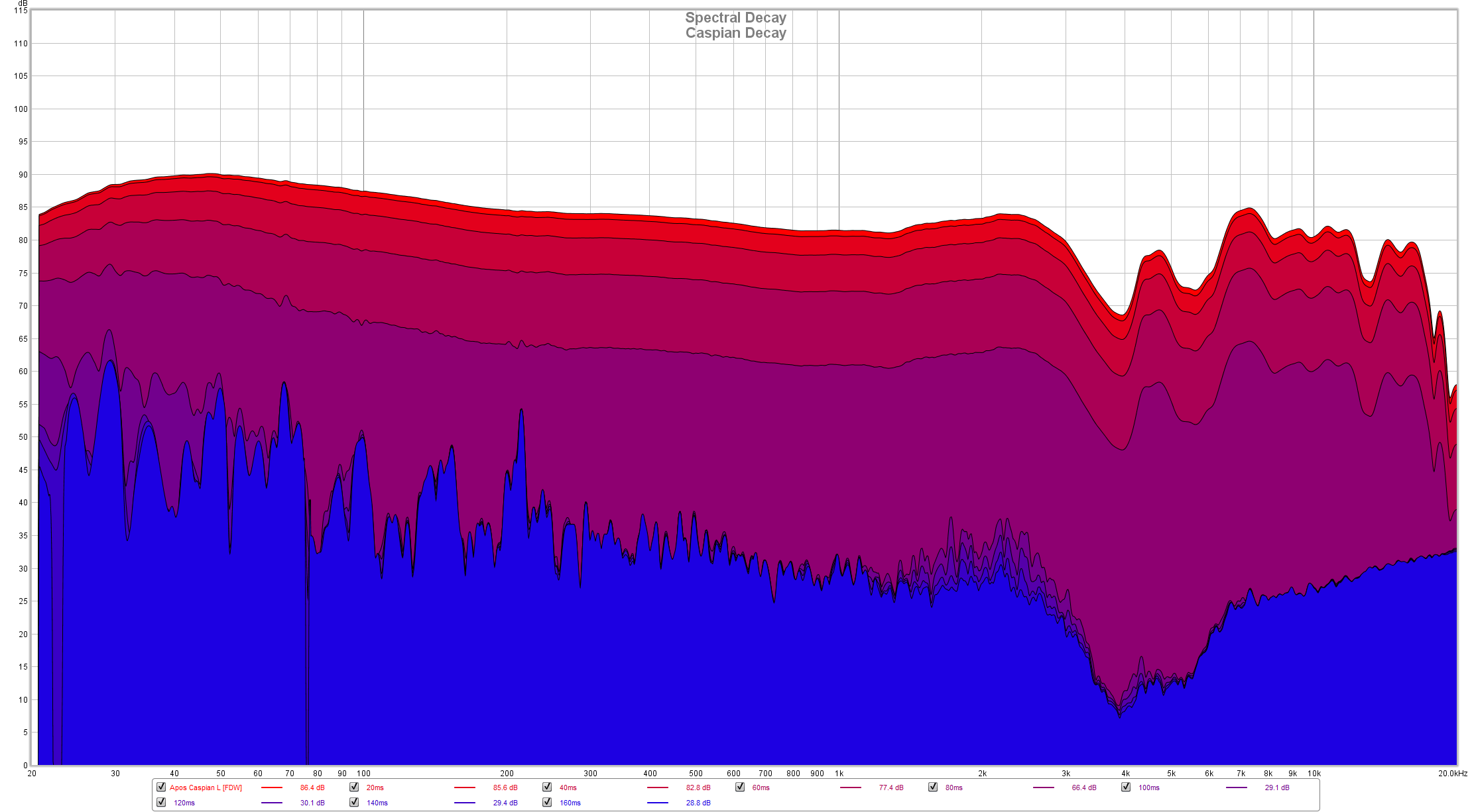 Waterfall combines the FR plot and decay into a single graph, you can clearly see the hot spots in the FR and the slower driver movement in the bass, but that’s normal behavior.