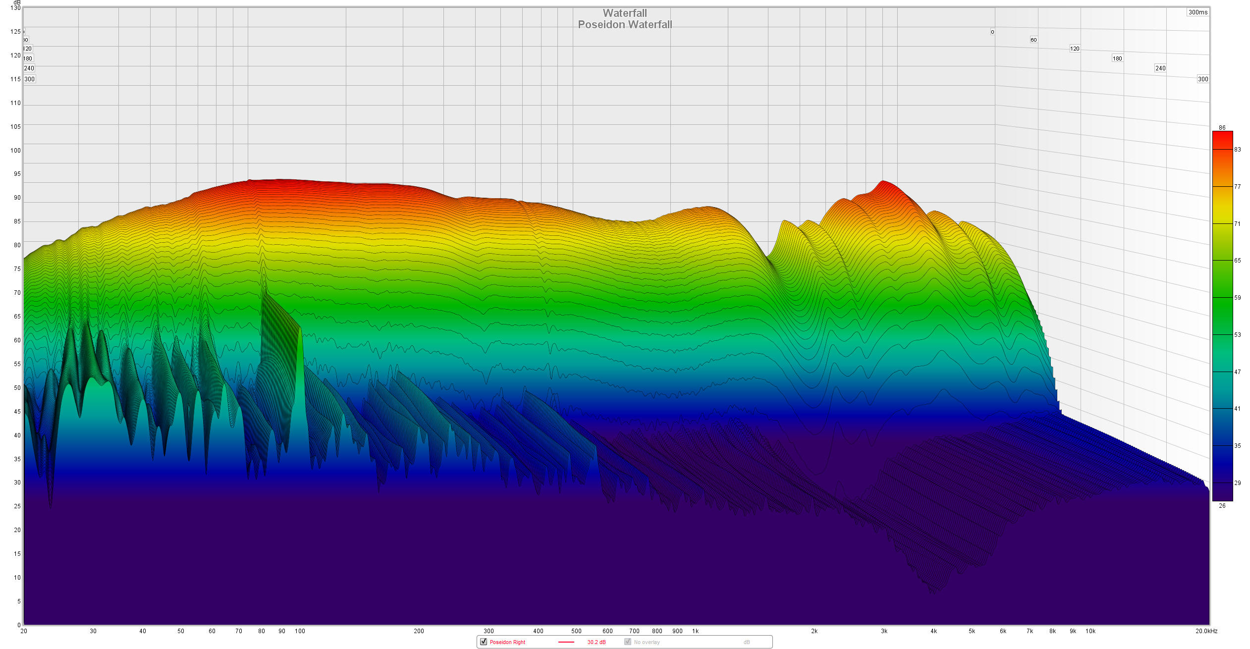 Waterfall combines the FR plot and decay into a single graph and you can clearly see the hot spots in the FR and the slower driver movement in the bass, but that’s normal behavior for open-backs.