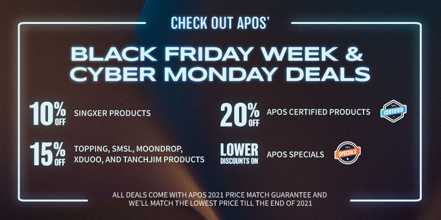 Apos will be offering you 15% Off for all Topping, SMSL, Moondrop, xDuoo, Tanchjim products, 10% Off Singxer products and 20% Off for Apos Certified Products. If you ask me, now it is probably you best chance on getting that sexy SMSL VMV D1SE, VMV D2, Topping D1SE, xDuoo XA-10, Moondrop KATO or that incredibly hot Singxer SA-1 at a nice discount. Please check all their deals right here.