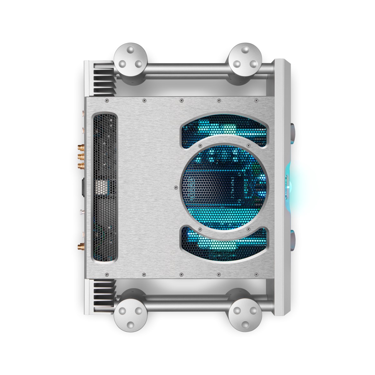 All casework is precision CNC machined from solid aircraft-grade aluminium, including the Integra legs. A black acrylic side-block alternative to the Integra legs is also available as a no-cost option. The upper panel features a pleasing vented design, which is enhanced with a dimmable LED light.