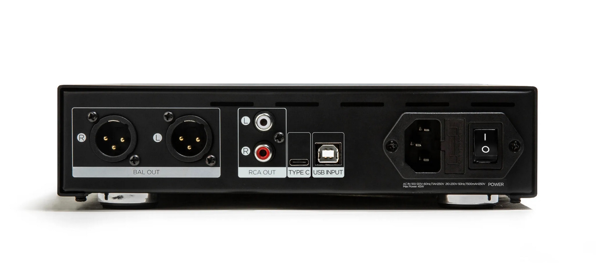 The compact physical dimensions of the EF400 contradict its substantial output. Measuring 9.5” D x 9” W x 2.5” H, the EF400 requires the bare minimum of desktop or rack space. The front panel includes four balanced outputs – 6.35mm single-ended, 3.5mm single-ended, 4.4mm balanced, XLR four-pin balanced – in addition to a four-level function switch and volume control. The rear input panel includes jacks for RCA, USB-B, and USB-C source connectors, in addition to dual (L/R) XLR three-pin full balanced line outputs, a rarity in products at this price point.