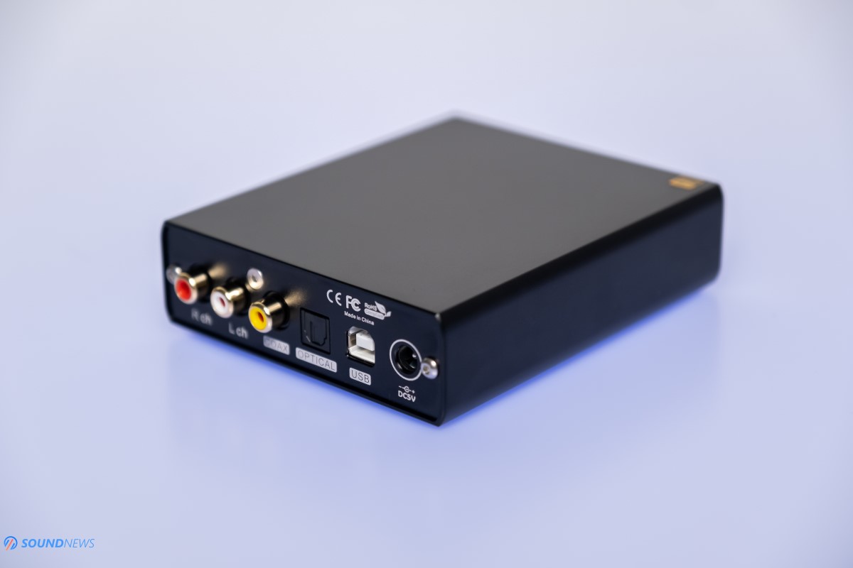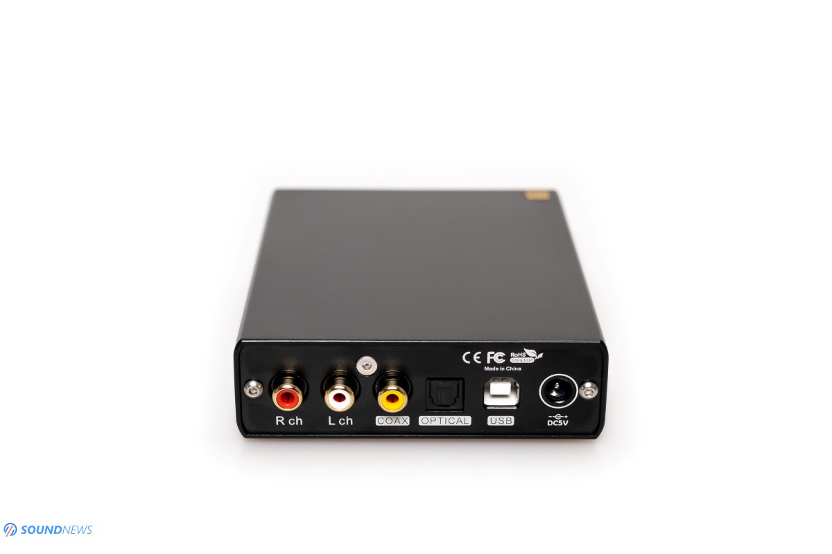On the back, you will find the 5V DC input, the USB input, an Optical input, a Coaxial input and the RCA output working in pure DAC mode (fixed volume position at 2V RMS) or working in Pre mode where volume can be controlled in 99 steps.